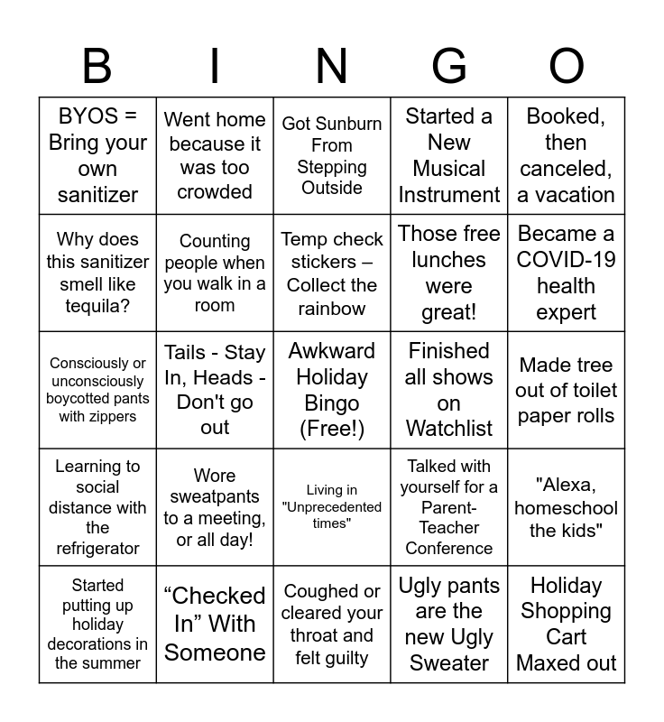 This bingo card has a free space and 43 words: Sorry I was on mute, Holiday Shopping Cart Maxed out, Legitimately Not Know What Day It Is, Started putting up holiday decorations in the summer, Been in a web meeting that should have been an email, Ugly pants are the new Ugly Sweater, Got Sunburn From Stepping Outside, Watched EVERYTHING on Netflix, Booked, then canceled, a vacation, “Checked In” With Someone, Started a New Musical Instrument, Finished all shows on Watchlist, Living in "Unprecedented times", Wore sweatpants to a meeting, or all day!, Ran out of coffee, Coughed or cleared your throat and felt guilty, Paid a child to leave you alone, Consciously or unconsciously boycotted pants with zippers, Visited garage for a vacation, Became a COVID-19 health expert, Went home because it was too crowded, Elbow bumps are the new high five, Used social distancing to avoid awkward family gatherings, BYOS = Bring your own sanitizer, 404 - Vacation not found, Made tree out of toilet paper rolls, Virtually put a pie in someone's face (for charity), Refused to add to age on birthday in 2020 as protest, Talked with yourself for a Parent-Teacher Conference, Learning to social distance with the refrigerator, Wishing wells source of 2020 coin shortage, "Alexa, homeschool the kids", Quarantini - 2020s most popular drink, Tails - Stay In, Heads - Don't go out, "Hindsight is 2020" can now officially retire, Come to the Dark Side, We have Masks, What the DOVIC is going on?, Temp check stickers – Collect the rainbow, Why does this sanitizer smell like tequila?, Those free lunches were great!, Only 10 people in Reagan?!?!, Counting people when you walk in a room and Being stuck in a zoom waiting room.