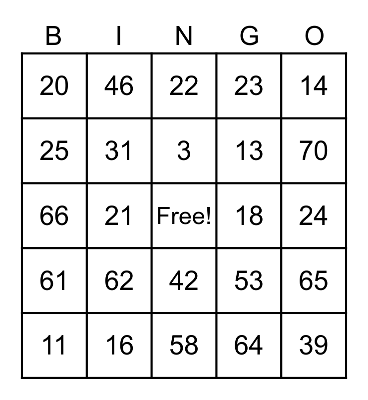 This bingo card has a free space and 74 words: 1, 2, 3, 4, 5, 6, 7, 8, 9, 10, 11, 12, 13, 14, 15, 16, 17, 18, 19, 20, 21, 22, 23, 24, 25, 26, 27, 28, 29, 30, 31, 32, 33, 34, 35, 36, 37, 38, 39, 40, 41, 42, 43, 44, 45, 46, 47, 48, 49, 50, 51, 52, 53, 54, 56, 57, 58, 59, 60, 61, 62, 63, 64, 65, 66, 67, 68, 69, 70, 71, 72, 73, 74 and 75.