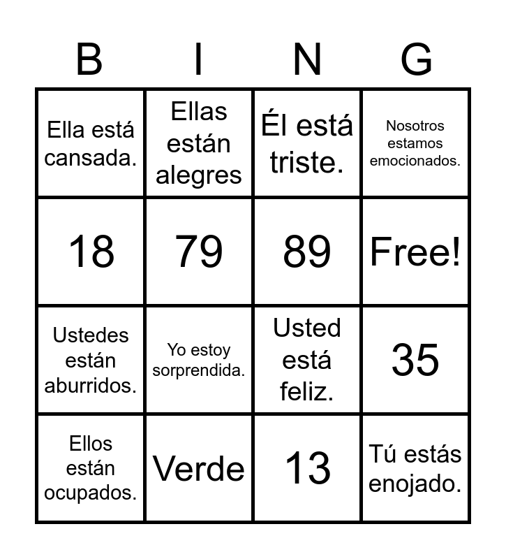 This bingo card has 18 words: Yo estoy sorprendida., Tú estás enojado., Él está triste., Ella está cansada., Usted está feliz., Nosotros estamos emocionados., Ellos están ocupados., Ellas están alegres, Free!, Ustedes están aburridos., 13, 18, 35, 79, 89, Azul, Verde and Rojo.
