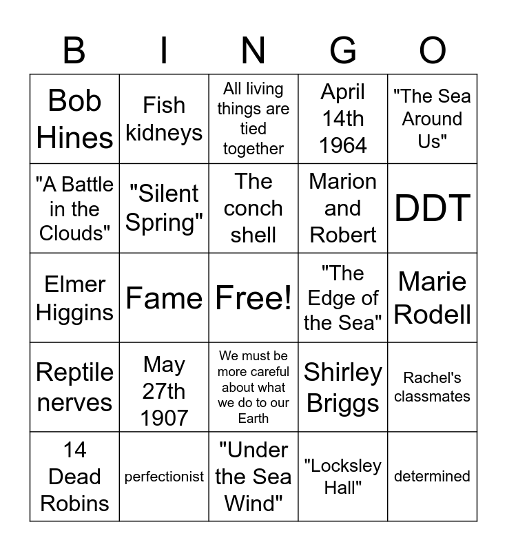This bingo card has a free space and 24 words: May 27th 1907, perfectionist, The conch shell, 14 Dead Robins, "The Sea Around Us", Bob Hines, "A Battle in the Clouds", Fish kidneys, "The Edge of the Sea", We must be more careful about what we do to our Earth, Marion and Robert, Elmer Higgins, Shirley Briggs, Rachel's classmates, "Silent Spring", "Locksley Hall", Marie Rodell, All living things are tied together, DDT, Fame, determined, Reptile nerves, April 14th 1964 and "Under the Sea Wind".