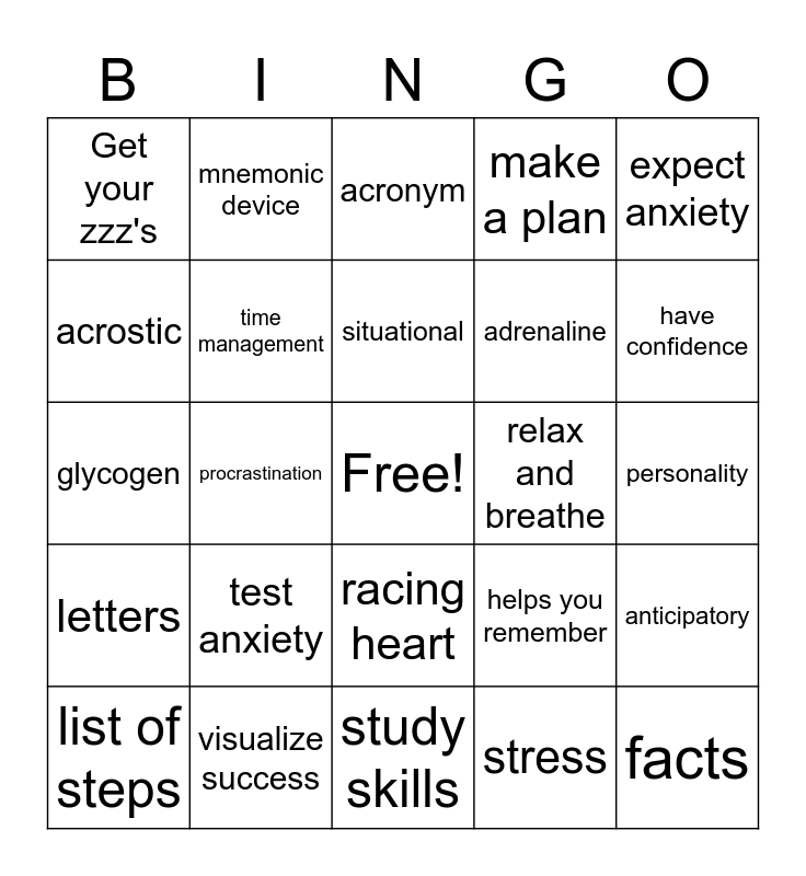 This bingo card has a free space and 24 words: test anxiety, visualize success, situational, list of steps, expect anxiety, Get your zzz's, acrostic, mnemonic device, relax and breathe, racing heart, adrenaline, glycogen, helps you remember, anticipatory, time management, stress, personality, acronym, have confidence, procrastination, facts, letters, make a plan and study skills.