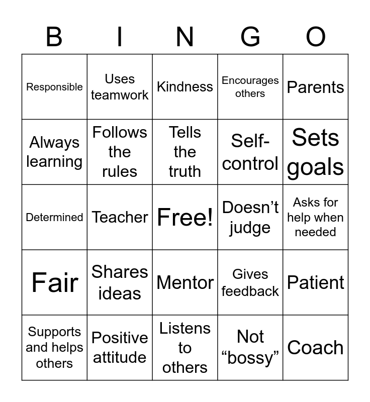 This bingo card has a free space and 27 words: Gives feedback, Problem solver, Self-control, Listens to others, Always learning, Kindness, Uses teamwork, Fair, Doesn’t judge, Patient, Determined, Encourages others, Supports and helps others, Positive attitude, Sets goals, Makes a plan, Follows the rules, Tells the truth, Shares ideas, Responsible, Asks for help when needed, Not “bossy”, Teacher, Coach, Mentor, Parents and Positive role model.