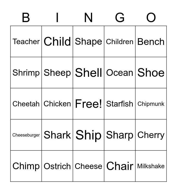 This bingo card has a free space and 24 words: Chimp, Shark, Shell, Chair, Bench, Teacher, Child, Shape, Starfish, Chipmunk, Cheetah, Sheep, Sharp, Cherry, Shrimp, Ostrich, Cheese, Children, Shoe, Cheeseburger, Chicken, Ship, Ocean and Milkshake.