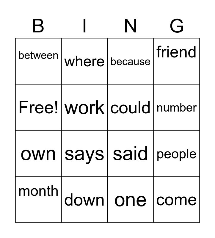 This bingo card has 16 words: down, people, because, between, own, where, said, one, Free!, work, month, friend, says, number, could and come.