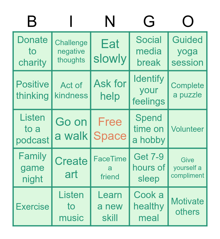 This bingo card has a free space and 29 words: Exercise, Therapy, Go on a walk, Meditate, Donate to charity, Eat slowly, Act of kindness, Create art, Spend time on a hobby, Listen to music, Volunteer, Motivate others, Learn a new skill, Cook a healthy meal, Complete a puzzle, Read a book, FaceTime a friend, Family game night, Guided yoga session, Listen to a podcast, Get 7-9 hours of sleep, Take 10 deep breaths, Identify your feelings, Positive thinking, Social media break, Challenge negative thoughts, Give yourself a compliment, Ask for help and Drink water.