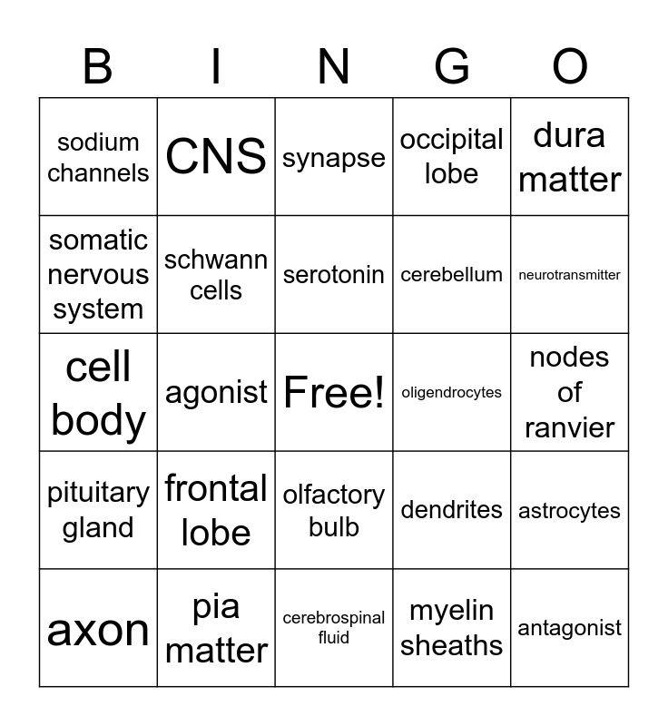 This bingo card has a free space and 24 words: frontal lobe, pia matter, serotonin, axon, dura matter, sodium channels, somatic nervous system, CNS, oligendrocytes, olfactory bulb, cerebellum, cell body, dendrites, astrocytes, schwann cells, myelin sheaths, nodes of ranvier, synapse, neurotransmitter, agonist, antagonist, pituitary gland, occipital lobe and cerebrospinal fluid.