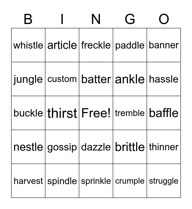 This bingo card has a free space and 29 words: harvest, hurdle, thirst, herd, whistle, freckle, custom, gossip, tremble, spindle, baffle, struggle, sprinkle, crumple, hassle, throttle, dazzle, nestle, banner, buckle, brittle, steeple, ankle, jungle, paddle, article, thinner, batter and infant.