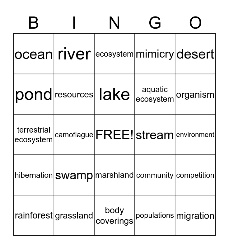 This bingo card has a free space and 24 words: swamp, grassland, lake, rainforest, desert, ocean, pond, river, stream, marshland, aquatic ecosystem, terrestrial ecosystem, community, competition, resources, populations, environment, ecosystem, organism, camoflague, migration, hibernation, mimicry and body coverings.