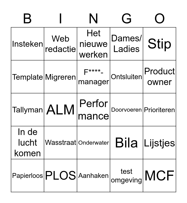 This bingo card has 25 words: Wasstraat, Aanhaken, F****- manager, Papierloos, Stip, Insteken, Template, Web redactie, Doorvoeren, Onderwater, Ontsluiten, Tallyman, Bila, Lijstjes, Migreren, MCF, Prioriteren, Het nieuwe werken, Product owner, ALM, Perfor mance, PLOS, In de lucht komen, Dames/ Ladies and test omgeving.