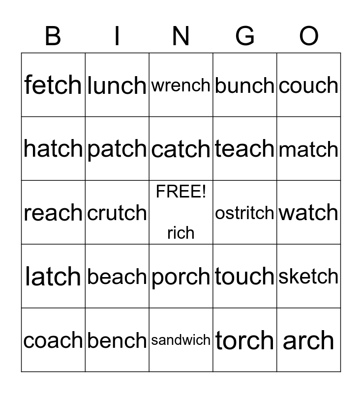 This bingo card has a free space and 24 words: beach, bench, catch, coach, couch, fetch, hatch, lunch, ostritch, porch, teach, reach, touch, sketch, patch, torch, watch, wrench, match, crutch, arch, latch, bunch and sandwich.