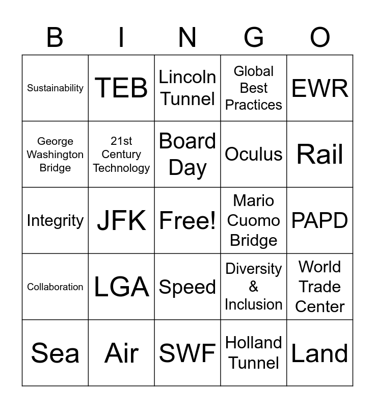 This bingo card has a free space and 24 words: LGA, Air, Board Day, Sea, EWR, Sustainability, George Washington Bridge, TEB, Mario Cuomo Bridge, Speed, Oculus, Integrity, Diversity & Inclusion, World Trade Center, 21st Century Technology, Holland Tunnel, PAPD, Lincoln Tunnel, Rail, JFK, Land, Collaboration, Global Best Practices and SWF.