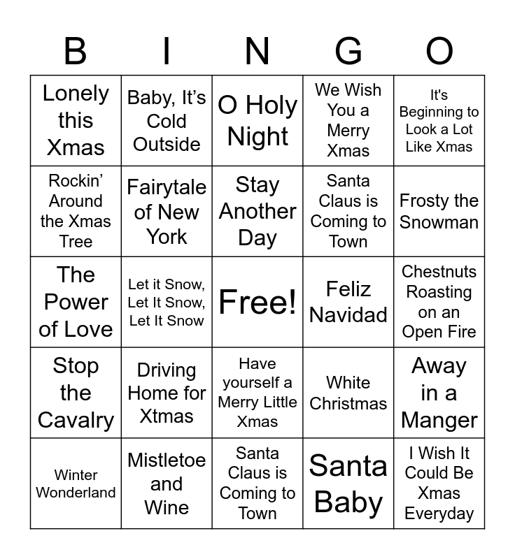 This bingo card has a free space and 49 words: Wonderful Xmas Time, I Wish It Could Be Xmas Everyday, Jingle Bell Rock, Santa Claus is Coming to Town, Driving Home for Xtmas, Step Into Xmas, Baby, It’s Cold Outside, Happy Xmas (War Is Over), Rockin’ Around the Xmas Tree, Do They Know It’s Xmas?, Fairytale of New York, We Wish You a Merry Xmas, Away in a Manger, White Christmas, Last Christmas, All I Want For Xmas Is You, Stay Another Day, Feliz Navidad, Santa Tell Me, It's Beginning to Look a Lot Like Xmas, Let it Snow, Let It Snow, Let It Snow, Santa Baby, Lonely this Xmas, Santa Claus is Coming to Town, Rudolph the Red Nosed Reindeer, Frosty the Snowman, Winter Wonderland, Silent Night, Have yourself a Merry Little Xmas, Stop the Cavalry, Rockin' Robin, Marys Boy Child, Xmas Time (Don't let the bells ring), Here comes Santa Claus, Mistletoe and Wine, Deck the Halls, Home Alone Theme, Walking in the Air, Chestnuts Roasting on an Open Fire, Jingle Bells, Ding Dong Merrily On High, The Twelve Days of Christmas, Silent Night, I Saw Mommy Kissing Santa Claus, The Power of Love, O Holy Night, Merry Xmas Everyone, 2000 Miles and Sleigh Ride.