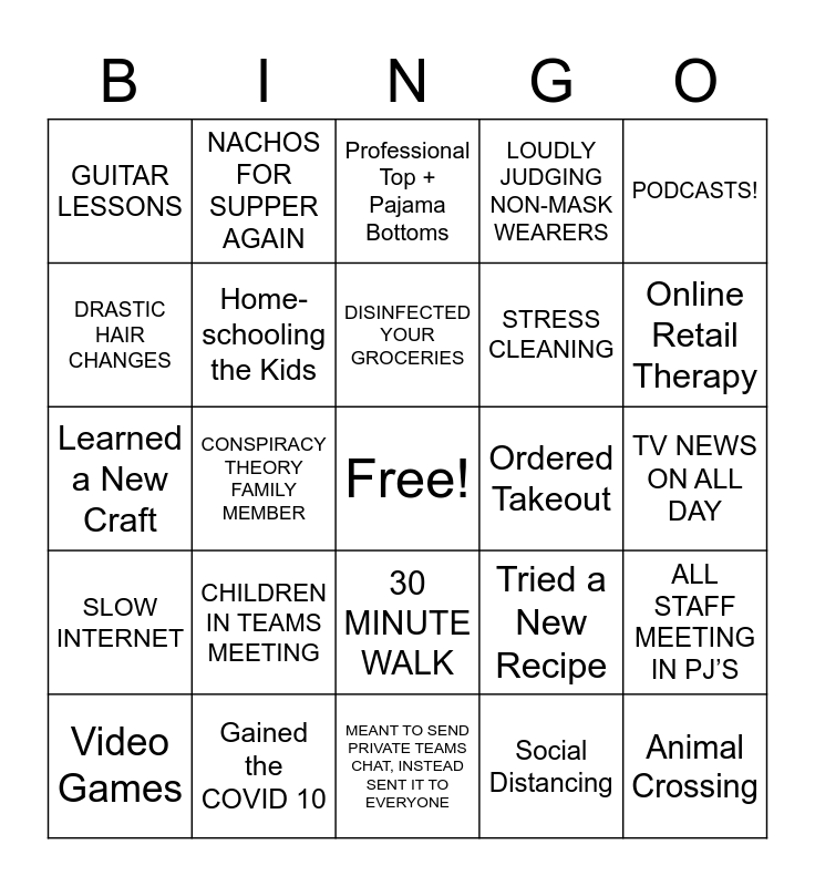 This bingo card has a free space and 64 words: PETS IN TEAMS MEETING, Midday Naps, “YOU’RE MUTED”, ALL STAFF MEETING IN PJ’S, SOURDOUGH STARTER, Adopted a Dog/Cat, NACHOS FOR SUPPER AGAIN, SILENTLY JUDGING NON-MASK WEARERS, DISINFECTED YOUR GROCERIES, ATTENDED A VIRTUAL HAPPY HOUR, 30 MINUTE WALK, MEME WAR WITH CO-WORKERS, TV NEWS ON ALL DAY, PODCASTS!, CAN’T REMEMBER LAST SHOWER, DRASTIC HAIR CHANGES, CONSPIRACY THEORY FAMILY MEMBER, GUITAR LESSONS, SHOPPING LIKE IT’S A HURRICANE, STRESS CLEANING, CHILDREN IN TEAMS MEETING, SLOW INTERNET, LOUDLY JUDGING NON-MASK WEARERS, Read a Book, BINGED TIGER KING, YOGA, Pets in Teams Meeting, Cut Your Own Hair, Day Drinking, Purple Hair, Cancelled Plans for a Trip, Work Pajamas, Made Your Own Kombucha, Online Shopping, Online Retail Therapy, Video Games, Zoom Family Holidays, Social Distancing, Awkward Frozen Screen Face, Home-schooling the Kids, Learned a New Craft, Ordered Takeout, Elbow Bump instead of Handshake, Bought 6 month supply of Toilet paper, Walked in on partner's Zoom Meeting, Animal Crossing, Gained the COVID 10, DIY Home Improvement Project, Tried a New Recipe, Binged "The Crown", Binged "Schitt's Creek", New Makeup Technique, MEANT TO SEND PRIVATE TEAMS CHAT, INSTEAD SENT IT TO EVERYONE, Hand Sanitizer, Forgetting your Mask, Clingy Pets, Professional Top + Pajama Bottoms, Smooth Miami Traffic, Roads Trips, Cried at how cheap Plane Tickets Are, Started investing in Stocks, New collection of face masks, Explored new places in South Florida and Laugh to keep from crying.
