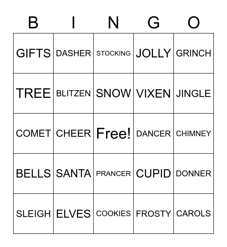 This bingo card has a free space and 24 words: SANTA, ELVES, SNOW, SLEIGH, GRINCH, GIFTS, TREE, DASHER, DANCER, PRANCER, VIXEN, COMET, CUPID, DONNER, BLITZEN, FROSTY, CHIMNEY, STOCKING, JINGLE, CHEER, CAROLS, BELLS, JOLLY and COOKIES.