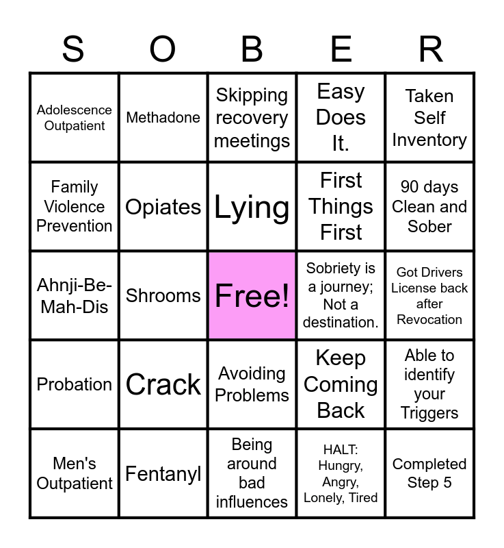 This bingo card has a free space and 64 words: Women's Services, Marijuana, Self-Isolating, HALT: Hungry, Angry, Lonely, Tired, Maintain Contact with Counselor, Behavioral Health, Methadone, Poor Nutrition, Sobriety is a journey; Not a destination., No Contact with police for 90 Days, Probation, Inhalants, Keep Coming Back, Taken Self Inventory, Women's Halfway House, Opiates, Lying, Easy Does It., Had a Mental Health Screening, Family Violence Prevention, Fentanyl, Avoiding Problems, First Things First, Completed Step 5, Rule 25, Meth, Repressing Emotions, One Day at a Time., Got Drivers License back after Revocation, Men's Outpatient, Cocaine, Self-Pity, Live & Learn, Got a Sponsor, Ahnji-Be-Mah-Dis, Heroin, Unwilling to Share in Meetings, This too shall Pass., Avoiding dangerous people & places, Adolescence Outpatient, Shrooms, Being around bad influences, Kiss: Keep It Simple Stupid, Attended 2 weeks worth of groups, Wellness Court, Crack, "just one more time", It's okay to not be okay., 90 days Clean and Sober, Addictions & Dependency Programs, PCP, Poor Sleeping Habits, Don't quit before the miracle happens., Able to identify your Triggers, Assessment Unit, Alcohol, Skipping recovery meetings, Let Go and Let God, Celebrate Sobriety Anniversary, Leech Lake Tribal Police, Benzodiazepine, Thinking "I can do this alone!", Progress not Perfection and Contact you PO within the last 30 days.