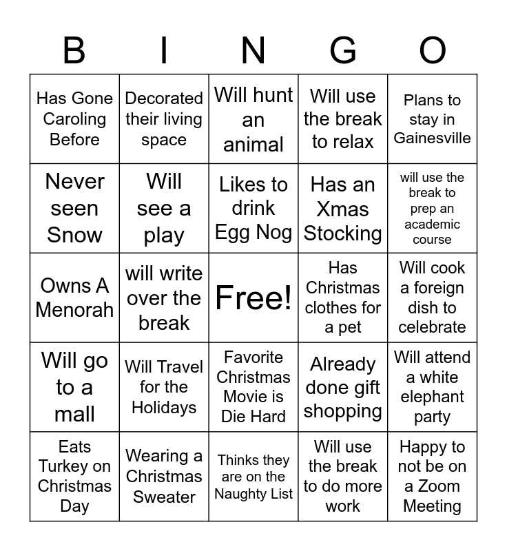 This bingo card has a free space and 24 words: Will Travel for the Holidays, Wearing a Christmas Sweater, Likes to drink Egg Nog, Eats Turkey on Christmas Day, Plans to stay in Gainesville, Has Gone Caroling Before, Never seen Snow, Decorated their living space, Has Christmas clothes for a pet, Favorite Christmas Movie is Die Hard, Has an Xmas Stocking, Owns A Menorah, Already done gift shopping, Will attend a white elephant party, Will see a play, Will use the break to do more work, Will cook a foreign dish to celebrate, Will hunt an animal, will use the break to prep an academic course, will write over the break, Happy to not be on a Zoom Meeting, Will go to a mall, Will use the break to relax and Thinks they are on the Naughty List.