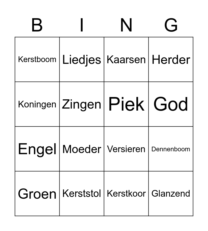 This bingo card has 57 words: Kerst, Kerstman, Kerstbal, Kerstboom, Slinger, Lampjes, Piek, Versiering, Engel, Jezus, Herder, Sterren, Herberg, Kribbe, Ezel, Schapen, Koningen, Dennenboom, Spar, Groen, Kerststol, Dorp, Schuur, Kaarsen, Geboren, God, Heilige, Hemel, Moeder, Vader, Vakantie, Eten, 1e kerstdag, 2e kerstdag, Kerstkoor, Zingen, Donker, Versieren, Sneeuwpop, Glanzend, Liedjes, Vredig, Gelukkig, Gezond, Slee, Nacht, Dankbaar, Drinken, Sprankel, Heer, Geurkaars, Mooi, Strooi, Avonden, Koud, Feest and December.