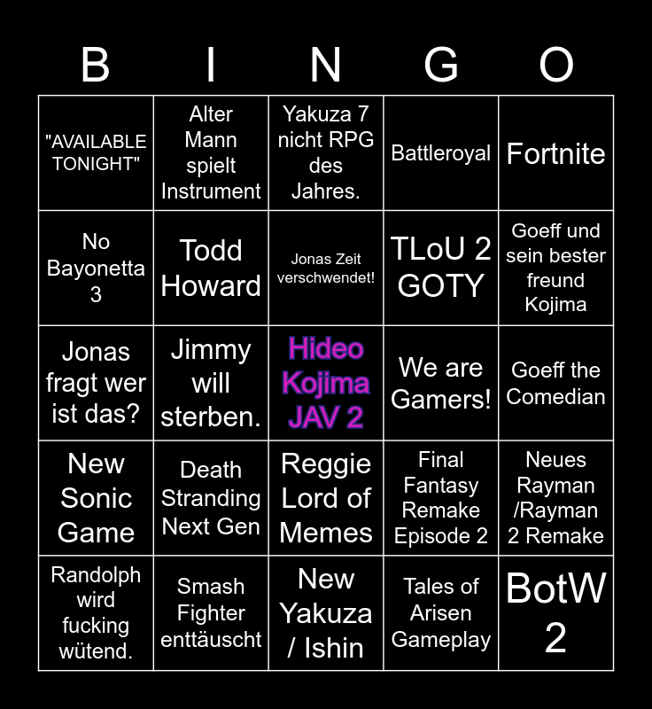 This bingo card has a free space and 24 words: Death Stranding Next Gen, Smash Fighter enttäuscht, Jonas Zeit verschwendet!, Randolph wird fucking wütend., Fortnite, "AVAILABLE TONIGHT", No Bayonetta 3, Alter Mann spielt Instrument, We are Gamers!, Reggie Lord of Memes, TLoU 2 GOTY, Jonas fragt wer ist das?, Final Fantasy Remake Episode 2, Neues Rayman /Rayman 2 Remake, Todd Howard, Tales of Arisen Gameplay, Goeff the Comedian, Yakuza 7 nicht RPG des Jahres., Goeff und sein bester freund Kojima, Jimmy will sterben., BotW 2, New Sonic Game, Battleroyal and New Yakuza / Ishin.