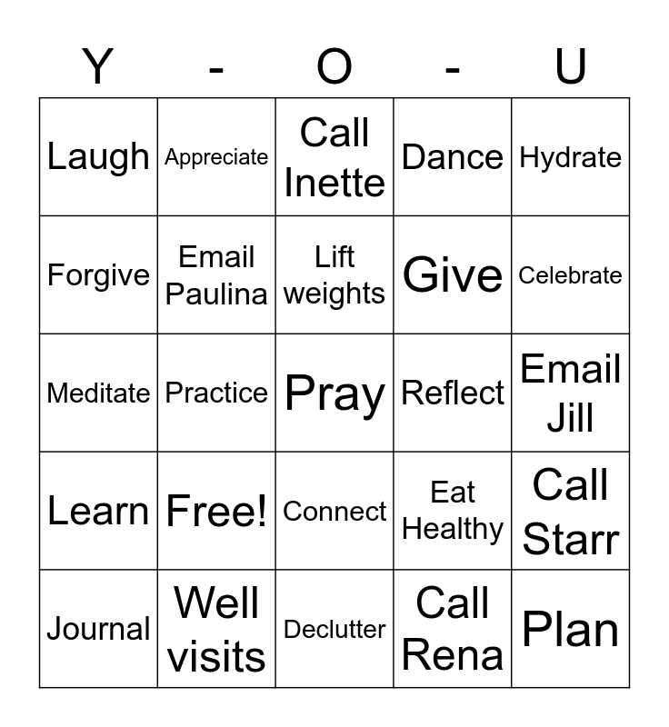 This bingo card has a free space and 24 words: Free!, Well visits, Lift weights, Journal, Hydrate, Laugh, Forgive, Appreciate, Reflect, Connect, Give, Meditate, Eat Healthy, Call Starr, Email Paulina, Call Rena, Email Jill, Call Inette, Celebrate, Practice, Plan, Learn, Dance and Declutter.