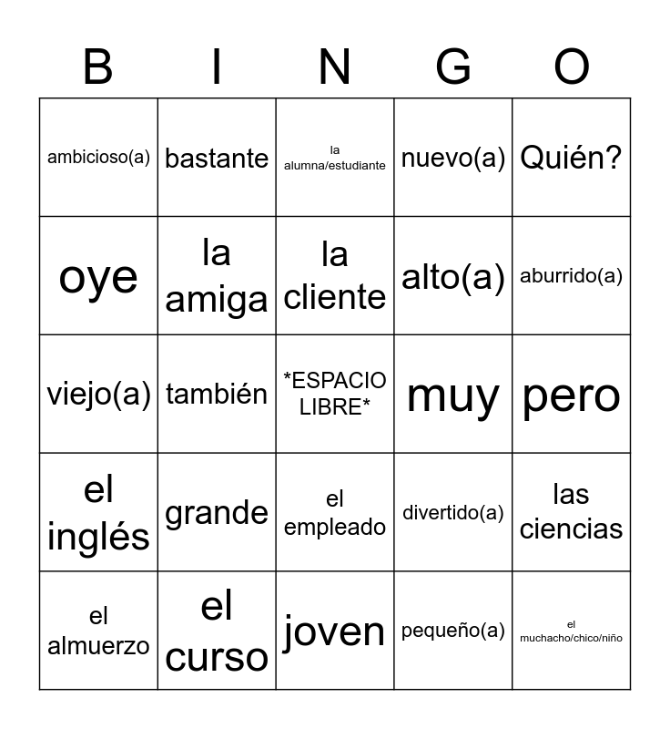 This bingo card has a free space and 29 words: el almuerzo, fácil, también, ?Cómo?, ambicioso(a), la alumna/estudiante, la amiga, grande, muy, el curso, pero, el muchacho/chico/niño, joven, pequeño(a), aburrido(a), moreno(a), el empleado, el inglés, Quién?, viejo(a), divertido(a), el maestro/el profesor, alto(a), oye, nuevo(a), bastante, las ciencias, la cliente and malo(a).