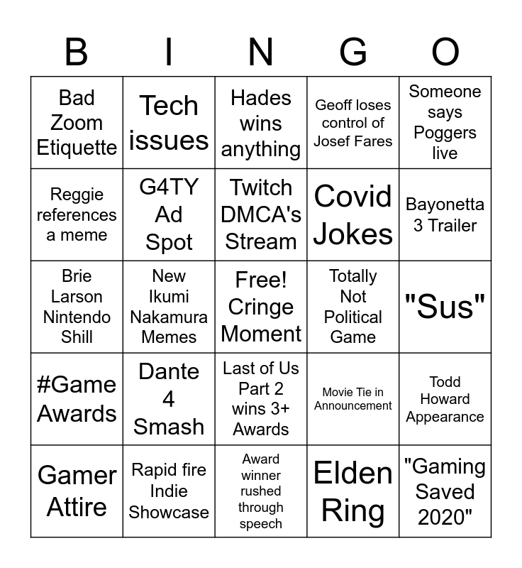 This bingo card has a free space and 24 words: Dante 4 Smash, Rapid fire Indie Showcase, Twitch DMCA's Stream, Gamer Attire, Someone says Poggers live, Bad Zoom Etiquette, Reggie references a meme, Tech issues, Totally Not Political Game, Last of Us Part 2 wins 3+ Awards, Covid Jokes, Brie Larson Nintendo Shill, Movie Tie in Announcement, Todd Howard Appearance, G4TY Ad Spot, Elden Ring, "Sus", Hades wins anything, Bayonetta 3 Trailer, New Ikumi Nakamura Memes, "Gaming Saved 2020", #Game Awards, Geoff loses control of Josef Fares and Award winner rushed through speech.