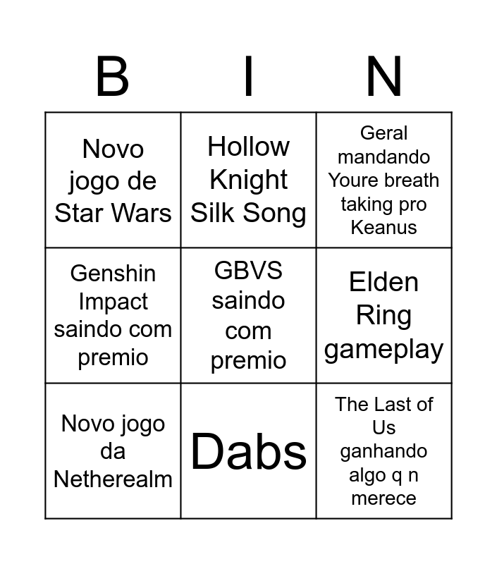 This bingo card has a free space and 8 words: Elden Ring gameplay, Geral mandando Youre breath taking pro Keanus, Hollow Knight Silk Song, Novo jogo da Netherealm, Novo jogo de Star Wars, The Last of Us ganhando algo q n merece, Genshin Impact saindo com premio and Dabs.