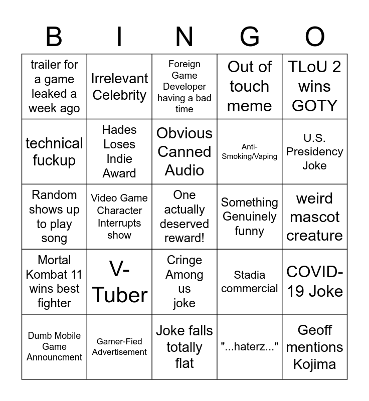 This bingo card has a free space and 24 words: V-Tuber, Gamer-Fied Advertisement, Obvious Canned Audio, Dumb Mobile Game Announcment, TLoU 2 wins GOTY, trailer for a game leaked a week ago, technical fuckup, Irrelevant Celebrity, Something Genuinely funny, Cringe Among us joke, Anti- Smoking/Vaping, Random shows up to play song, Stadia commercial, COVID-19 Joke, Hades Loses Indie Award, "...haterz...", weird mascot creature, Foreign Game Developer having a bad time, U.S. Presidency Joke, Video Game Character Interrupts show, Geoff mentions Kojima, Mortal Kombat 11 wins best fighter, Out of touch meme and Joke falls totally flat.