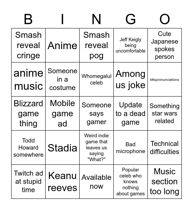 This bingo card has a free space and 24 words: Stadia, Keanu reeves, Whomegalul celeb, Twitch ad at stupid time, Cute Japanese spokes person, Smash reveal cringe, anime music, Anime, Update to a dead game, Weird indie game that leaves us saying "What?", Among us joke, Blizzard game thing, Bad microphone, Technical difficulties, Someone in a costume, Popular celeb who knows nothing about games, Something star wars related, Smash reveal pog, Mispronunciations, Mobile game ad, Music section too long, Todd Howard somewhere, Jeff Keigly being uncomfortable and Available now.