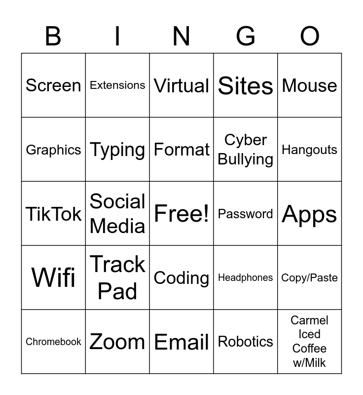 This bingo card has a free space and 29 words: Chromebook, Google Classroom, Social Media, Drive, Screen, Virtual, Typing, Track Pad, Password, Zoom, Apps, Carmel Iced Coffee w/Milk, Email, Robotics, Hangouts, Digital Citizenship, Coding, Wifi, Mouse, TikTok, Headphones, Promethean Board, Cyber Bullying, Graphics, Sites, Extensions, Copy/Paste, Format and Share.