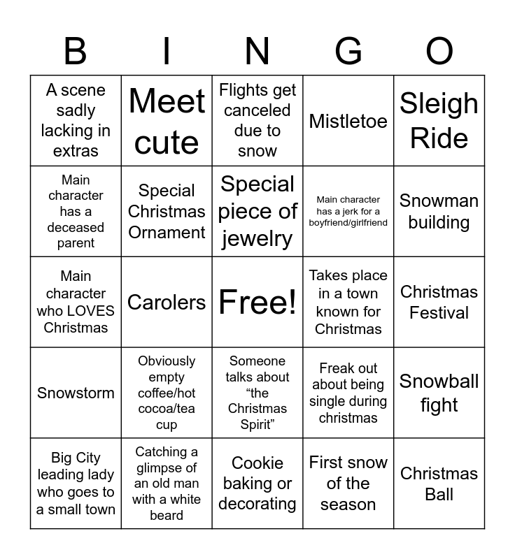 This bingo card has a free space and 39 words: Hot chocolate, Tree decorating, A town tree lighting, Special Christmas Ornament, Big City leading lady who goes to a small town, Someone talks about “the Christmas Spirit”, Special piece of jewelry, Old flame, Sleigh Ride, Snowstorm, Carolers, Mistletoe, Christmas Ball, Christmas Festival, Takes place in a town known for Christmas, Obviously empty coffee/hot cocoa/tea cup, Baking or decorating Christmas cookies, A scene sadly lacking in extras, Oddly themed Christmas thing - i.e. Restaurant with christmas themed menu, Freak out about being single during christmas, Main character has a deceased parent, Cookie baking or decorating, Main character has a jerk for a boyfriend/girlfriend, Snowman building, A work deadline, A potential promotion, Fake girlfriend/boyfriend or fake fiance, Someone has a favorite Christmas song, Enemies fall in love, Meet cute, Ice skating, Trapped in snow, Flights get canceled due to snow, Catching a glimpse of an old man with a white beard, First snow of the season, Snow angel, Snowball fight, Main character who LOVES Christmas and Main character who DOES NOT LIKE Christmas.