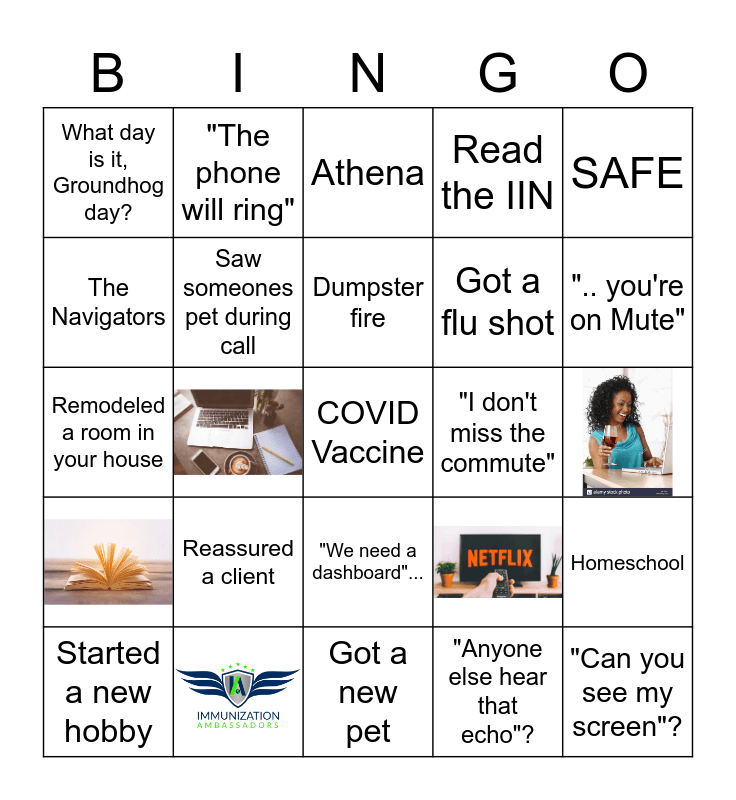 This bingo card has 5 images, a free space and 24 words: Started a new hobby, "Ask Kyle", "Oh good, another Zoom meeting", What day is it, Groundhog day?, Athena, Saw someones pet during call, Reassured a client, "I don't miss the commute", "Can you see my screen"?, Got a new pet, "Anyone else hear that echo"?, ".. you're on Mute", Worked out at home, "We need a dashboard"..., SAFE, Remodeled a room in your house, Pharmacy scheduler, Got a flu shot, The Navigators, Read the IIN, "The phone will ring", Homeschool, Dumpster fire and Daily stand up.