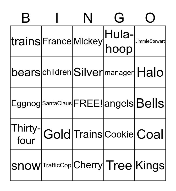 This bingo card has a free space and 83 words: Santa, reindeer, Mickey, airplane, star, Jesus, Christmas, candles, shepard, sleigh, elves, tree, children, angels, skaters, trains, snow, bears, toys, soldiers, Mary, manager, Kings, candy, SantaClaus, WhiteChristmas, Ebenezer, Clara, Green, Pigpen, Gold, StockingStuffers, Stop, Eggnog, Rudolph, HisWings, Cherry, Tinsel, Halo, Thirty-four, Nine, Lawn, Bannister, Rose, Frosty, Italy, France, Canada, Blitzen, Angel, Cookie, Hula-hoop, Bells, GeneAutry, Rockin, SilverBells, BlueChristmas, 5-cents, TrafficCop, Nutcracker, CharlesDickens, Architect, Cookies, JimmieStewart, Button, Coal, Cherry, Pumpkin, Candy, Manger, Soldiers, Toys, Bears, Trains, Tree, Sleigh, Raise, Silver, Mistletoe, TeddyBear, Peace, GoodWill and Snoopy.