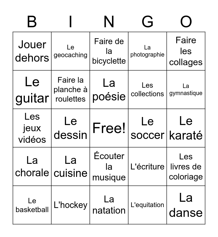 This bingo card has a free space and 29 words: Le basketball, La peinture, Le dessin, Lire, Jouer dehors, Faire de la bicyclette, Faire la planche à roulettes, La cuisine, Le soccer, L'hockey, Le karaté, La danse, La natation, L'equitation, La gymnastique, Le shopping, Écouter la musique, La chorale, Faire les collages, Les jeux vidéos, L'écriture, Le yoga, Les collections, Le guitar, La photographie, Le geocaching, Les livres de coloriage, La poésie and Le théâtre.