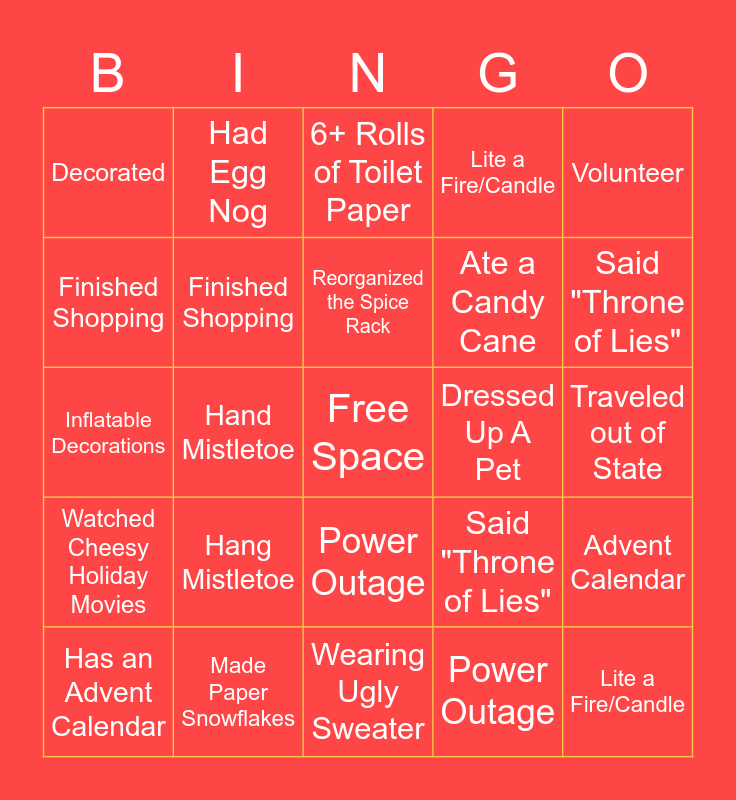 ⚠ This card has duplicate items: Traveled out of State (2), Baked Cookies (2), Decorated (2), Wearing Ugly Sweater (2), Sent Holiday Cards (2), Finished Shopping (2), Inflatable Decorations (2), Watched Cheesy Holiday Movies (2), Lite a Fire/Candle (2), Had Egg Nog (2), Made Hot Cocoa (2), Volunteer (2), Made Paper Snowflakes (2), Free Space (2), Dressed Up A Pet (2), Broken Ornament (2), Said "Throne of Lies" (2), 6+ Rolls of Toilet Paper (2), Quit DIY project (2), Reorganized the Spice Rack (2), Power Outage (2), Celebrated a Birthday during COVID (2)