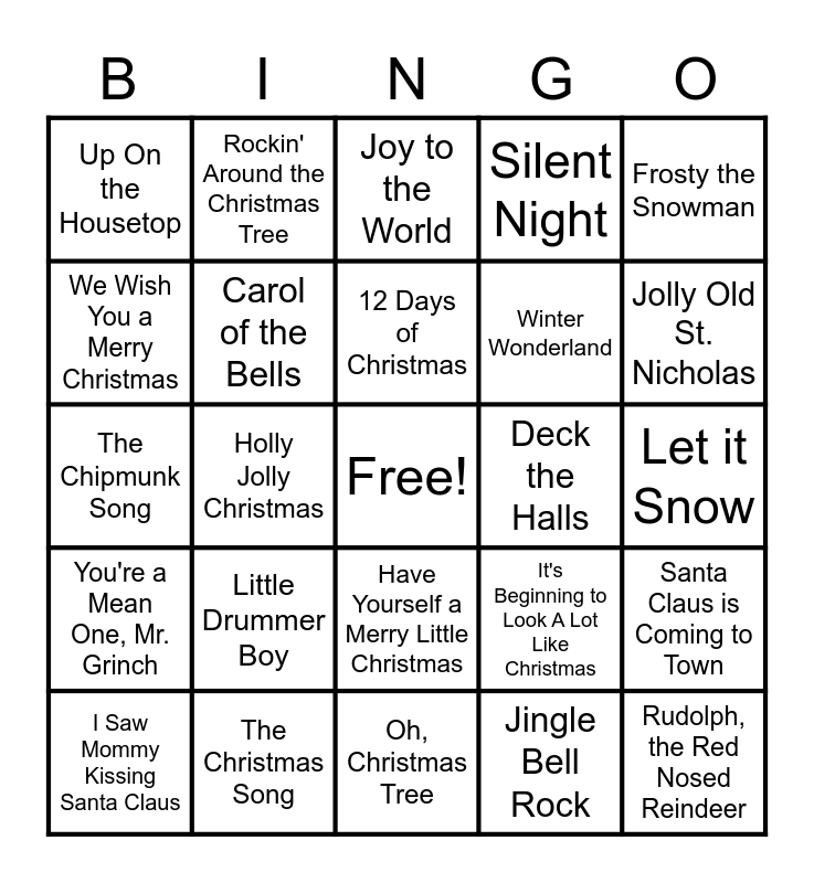 This bingo card has a free space and 26 words: Have Yourself a Merry Little Christmas, Jingle Bell Rock, 12 Days of Christmas, The Christmas Song, Frosty the Snowman, Up On the Housetop, We Wish You a Merry Christmas, Rockin' Around the Christmas Tree, Let it Snow, It's Beginning to Look A Lot Like Christmas, Winter Wonderland, The Chipmunk Song, Santa Claus is Coming to Town, I Saw Mommy Kissing Santa Claus, Holly Jolly Christmas, Jingle Bells, Silent Night, You're a Mean One, Mr. Grinch, Joy to the World, Rudolph, the Red Nosed Reindeer, Jolly Old St. Nicholas, Oh, Christmas Tree, Deck the Halls, Little Drummer Boy, Carol of the Bells and Mele Kalikimaka.