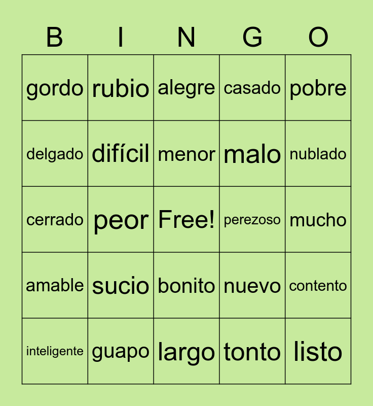 This bingo card has a free space and 54 words: alto, amable, antipático, bajo, bonito, bueno, casado, corto, delgado, feo, gordo, grande, guapo, inteligente, joven, largo, listo, malo, moreno, mucho, nuevo, pequeño, perezoso, pobre, rico, rubio, simpático, soltero, todo, tonto, trabajador, viejo, abierto, aburrido, alegre, cansado, cerrado, contento, mejor, difícil, fácil, furioso, limpio, ordenado, sucio, triste, más, mayor, menor, peor, nublado, preocupado, seguro and soleado.