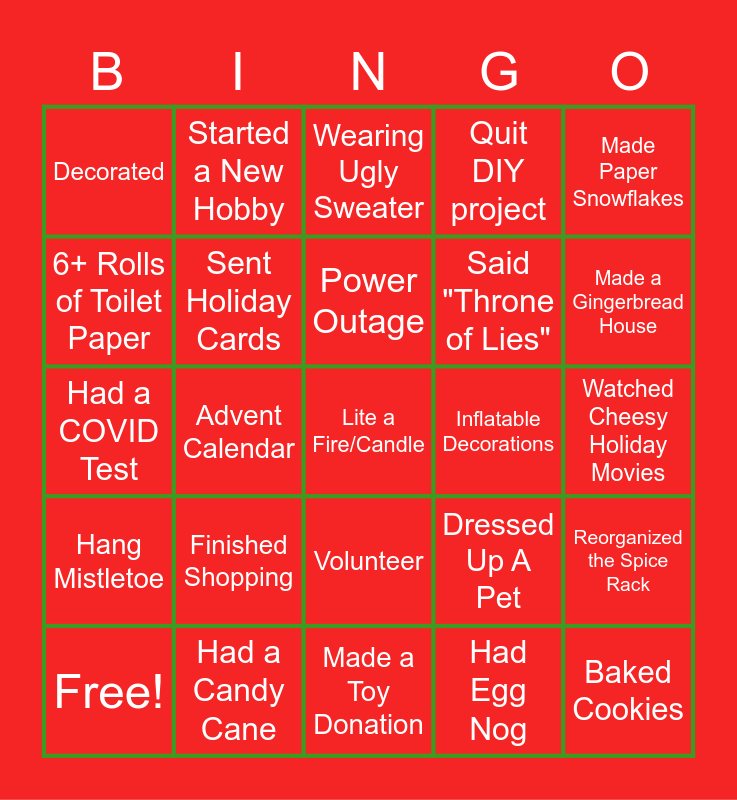This bingo card has 29 words: Free!, Traveled out of State, Advent Calendar, Baked Cookies, Decorated, Wearing Ugly Sweater, Sent Holiday Cards, Finished Shopping, Inflatable Decorations, Had a Candy Cane, Watched Cheesy Holiday Movies, Lite a Fire/Candle, Made a Toy Donation, Had Egg Nog, Made a Gingerbread House, Made Hot Cocoa, Volunteer, Hang Mistletoe, Made Paper Snowflakes, Had a COVID Test, Dressed Up A Pet, Broken an Ornament, Said "Throne of Lies", 6+ Rolls of Toilet Paper, Quit DIY project, Started a New Hobby, Reorganized the Spice Rack, Power Outage and Had a Birthday during COVID.
