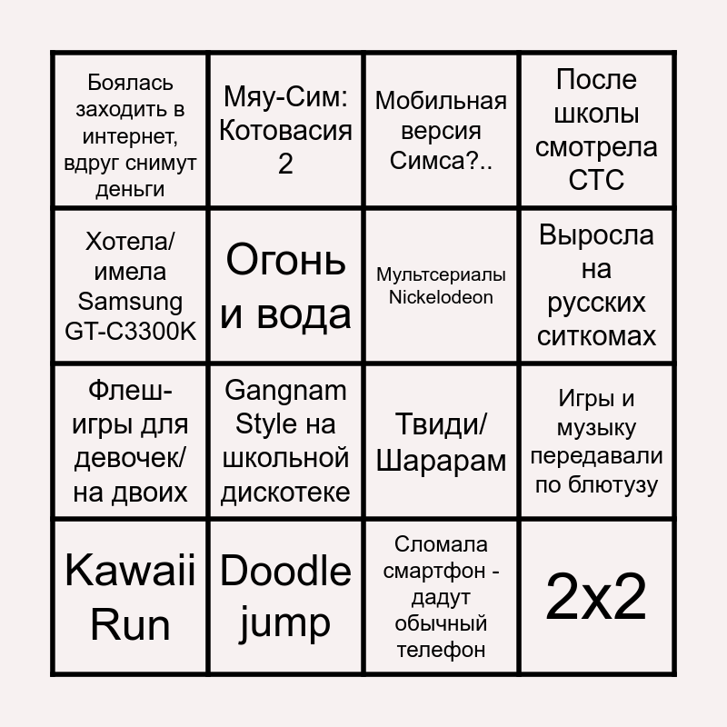 This bingo card has 16 words: Doodle jump, Игры и музыку передавали по блютузу, Мобильная версия Симса?.., Боялась заходить в интернет, вдруг снимут деньги, Флеш-игры для девочек/ на двоих, Мяу-Сим: Котовасия 2, Твиди/Шарарам, Сломала смартфон - дадут обычный телефон, Хотела/имела Samsung GT-C3300K, Огонь и вода, Kawaii Run, После школы смотрела СТС, Gangnam Style на школьной дискотеке, Выросла на русских ситкомах, Мультсериалы Nickelodeon and 2х2.