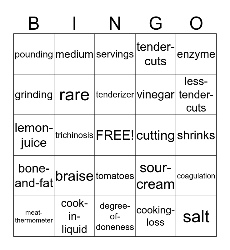 This bingo card has a free space and 24 words: braise, cook-in-liquid, tenderizer, meat-thermometer, enzyme, pounding, grinding, medium, cutting, tomatoes, vinegar, lemon-juice, sour-cream, coagulation, rare, cooking-loss, shrinks, servings, less-tender-cuts, trichinosis, salt, bone-and-fat, tender-cuts and degree-of-doneness.