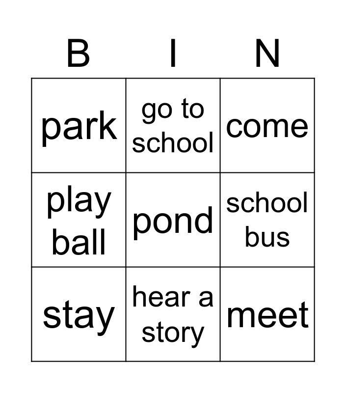 This bingo card has a free space and 8 words: school bus, come, go to school, stay, park, meet, play ball and hear a story.
