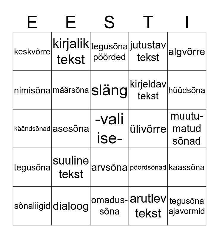 This bingo card has a free space and 24 words: suuline tekst, dialoog, släng, sõnaliigid, algvõrre, keskvõrre, nimisõna, kirjalik tekst, ülivõrre, arvsõna, kirjeldav tekst, käändsõnad, pöördsõnad, kaassõna, määrsõna, arutlev tekst, muutu-matud sõnad, tegusõna pöörded, hüüdsõna, asesõna, tegusõna ajavormid, tegusõna, jutustav tekst and omadus-sõna.