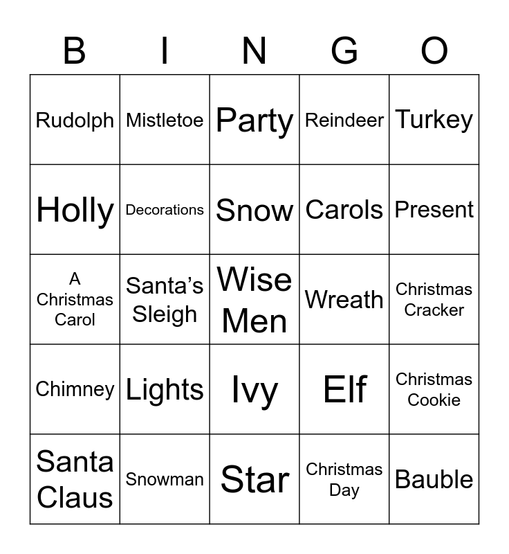 This bingo card has 25 words: Lights, Star, Snow, Santa Claus, Turkey, Rudolph, Holly, Mistletoe, Wreath, Ivy, Carols, A Christmas Carol, Elf, Christmas Cookie, Decorations, Bauble, Christmas Cracker, Party, Present, Santa’s Sleigh, Wise Men, Snowman, Chimney, Reindeer and Christmas Day.