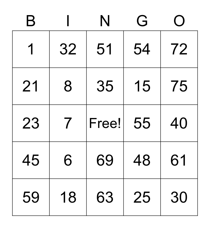 This bingo card has a free space and 24 words: 6, 18, 35, 59, 72, 1, 21, 32, 55, 69, 15, 23, 48, 61, 8, 25, 40, 51, 75, 7, 30, 45, 54 and 63.