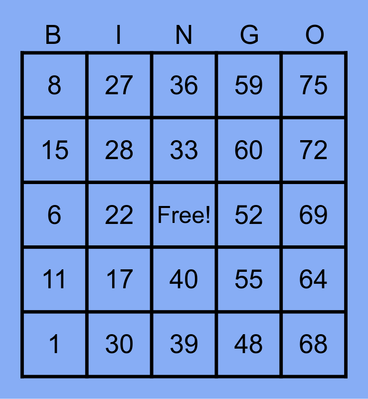 This bingo card has a free space and 24 words: 1, 17, 33, 48, 75, 8, 27, 36, 52, 69, 6, 28, 55, 64, 15, 30, 39, 59, 72, 11, 22, 40, 60 and 68.