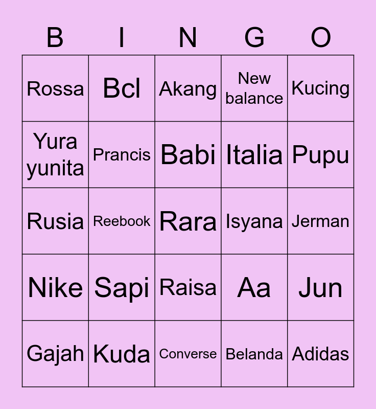 This bingo card has a free space and 24 words: Sapi, Kuda, Babi, Gajah, Kucing, Rossa, Yura yunita, Bcl, Isyana, Raisa, Italia, Rusia, Aa, Jun, Prancis, Belanda, Jerman, Akang, Pupu, Reebook, Adidas, Nike, New balance and Converse.