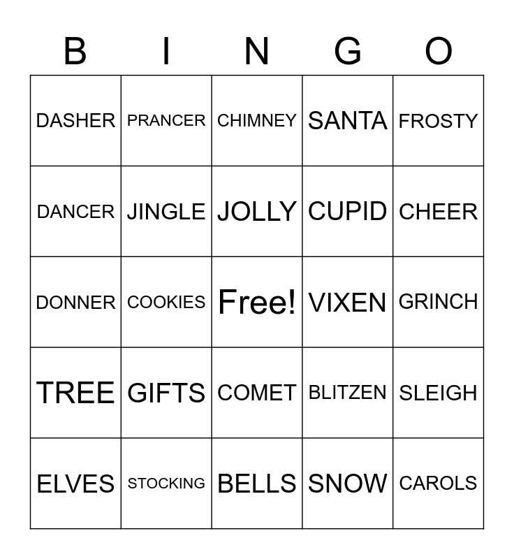 This bingo card has a free space and 24 words: GIFTS, STOCKING, JOLLY, ELVES, FROSTY, DASHER, DANCER, PRANCER, VIXEN, COMET, CUPID, DONNER, BLITZEN, SLEIGH, JINGLE, SNOW, GRINCH, CHIMNEY, CHEER, COOKIES, CAROLS, TREE, SANTA and BELLS.
