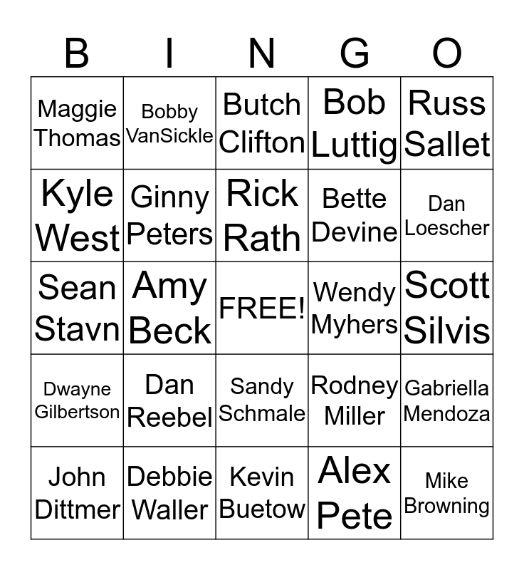 This bingo card has a free space and 53 words: Barb Bishop, Mike Browning, Chad Ludlum, Alex Pete, Dan Reebel, Tammy Trewyn, Bobby VanSickle, Brian Kobischka, Kyle West, Charisse Kosman, Ginny Peters, Junior Ortiz, Gabriella Mendoza, Rodney Miller, Dennis Keeney, John Dittmer, Rick Rath, Wendy Myhers, Peggy Pleasant, Russ Sallet, Amy Beck, Josette Fillbach, Bette Devine, Maggie Thomas, Cecil Piper, Debbie Waller, Don Morello, Lori Sturdevant, Flint Hanson, Dan Loescher, Ron Messinger, Burk Geissler, Kelli Harris, David Greenlee, David West, Larry Studesville, Bob Luttig, Kevin Buetow, Butch Clifton, Steve Bernier, Laureen Spielman, John Thompson, Scott Silvis, Danielle Harnack, Steve Tucker, Sandy Schmale, Gail Taylor, Millie Zinnecker, Sean Stavn, Dwayne Gilbertson, Alex Brown, Pete Thomas and Jon Anderson.