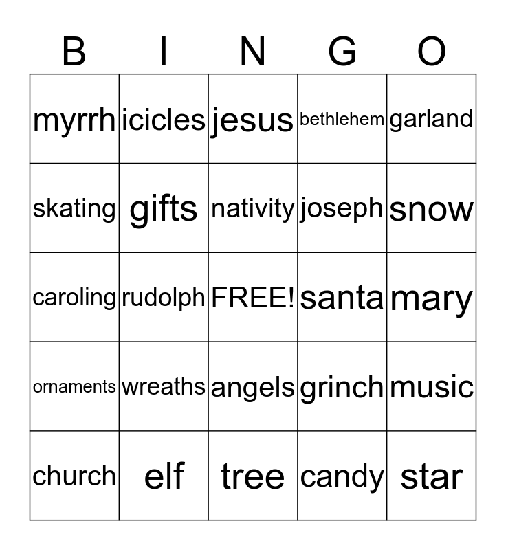 This bingo card has a free space and 24 words: wreaths, elf, nativity, church, garland, myrrh, skating, icicles, santa, angels, joseph, caroling, grinch, music, gifts, candy, mary, jesus, snow, rudolph, star, ornaments, bethlehem and tree.