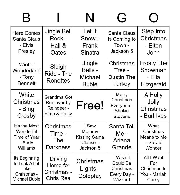This bingo card has a free space and 43 words: Fairytale of New York - Pogues, All I Want For Christmas Is You - Mariah Carey, Last Christmas - Wham!, Its Beginning to Look A Lot Like Christmas - Michael Buble, Feliz Navidad - Jose Feliciano, I Wish it Could Be Christmas Every Day - Wizzard, Let It Snow - Frank Sinatra, Baby Its Cold Outside - Idina Menzel & Michael Buble, Step Into Christmas - Elton John, Driving Home for Christmas - Chris Rea, Santa Claus Is Coming to Town - Jackson 5, Merry Christmas Everyone - Shakin Stevens, I Saw Mommy Kissing Santa Clause - Jackson 5, Christmas Time - The Darkness, Do They Know Its Christmas - Band Aid, Christmas Lights - Coldplay, Rudolph the Red Nosed Reindeer - Dean Martin, White Christmas - Bing Crosby, Rockin Around the Christmas Tree - Brenda Lee, Frosty The Snowman - Ella Fitzgerald, Jingle Bell Rock - Hall & Oates, Run Rudolph Run - Chuck Berry, Thank God Its Christmas - Queen, Here Comes Santa Claus - Elvis Presley, Have Yourself A Merry Little Christmas - Frank Sinatra, A Holly Jolly Christmas - Burl Ives, Happy Christmas (War is Over) - John Lennon, Please Come Home For Chirstmas - Eagles, Santa Tell Me - Ariana Grande, It’s the Most Wonderful Time of Year - Andy Williams, We Wish You A Merry Christmas - John Williams, What Christmas Means to Me - Stevie Wonder, Little Drummer Boy - Johnny Cash, Grandma Got Run over by Reindeer - Elmo & Patsy, The Night Santa Went Crazy - Weird Al Yankovic, Santa Baby - Samantha Jade, Christmas Baby Please Come Home - U2, Jingle Bells - Michael Buble, Winter Wonderland - Tony Bennett, Christmas Tree - Dustin The Turkey, Winter Song - Sara Bareillis, Sleigh Ride - The Ronettes and Christmas in Hollis - Run DMC.