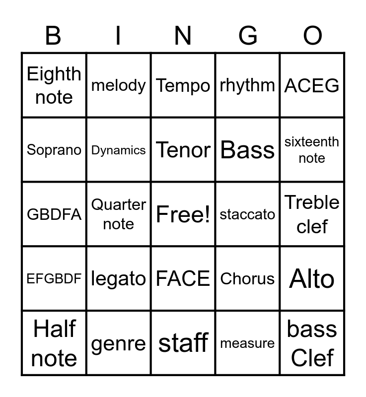 This bingo card has a free space and 29 words: Half note, Whole Note, Quarter note, Dotted half note, Eighth note, Tempo, Dynamics, legato, staccato, genre, Treble clef, bass Clef, staff, measure, sixteenth note, bar lines, FACE, EFGBDF, ACEG, GBDFA, Chorus, Verse, Bass, Soprano, rhythm, melody, Alto, Tenor and beat.